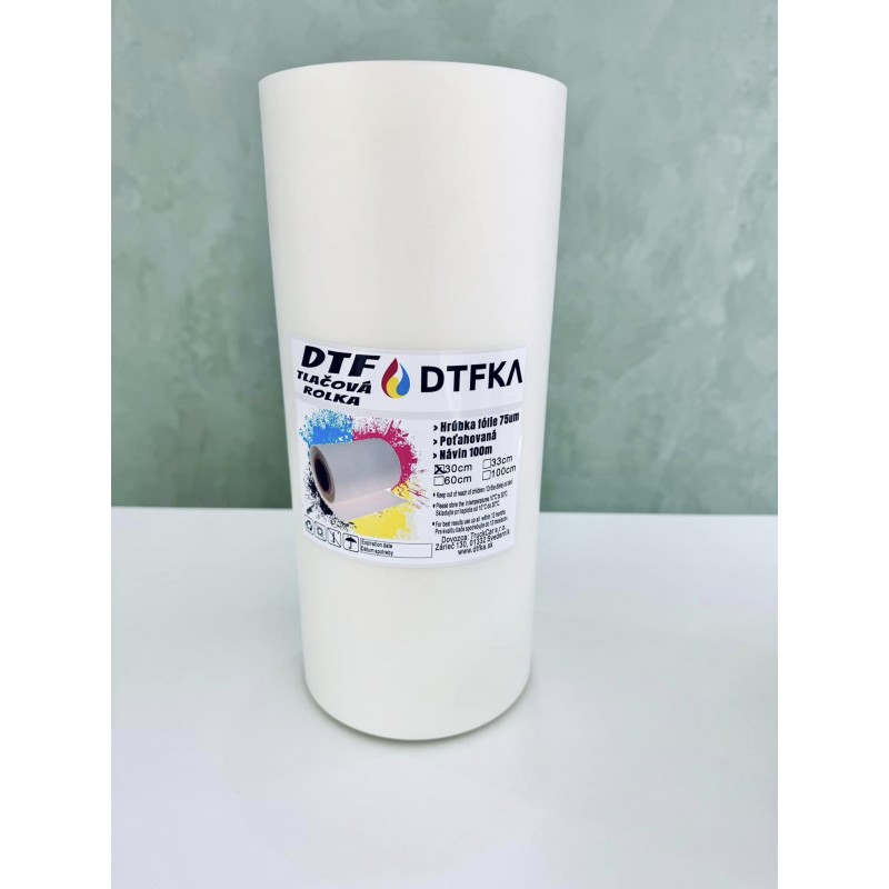 DTF ROLKOVÁ FÓLIA je fólia určená na tlač DTF technológiou a následný prenos na materiál. Grafika sa vytlačí špeciálne upravenou DTF tlačiarňou, následne sa nanáša DTF prášok(lepidlo). Tlač DTF tlačiarňou je možný iba na tento typ fólie(prípadne hárky).